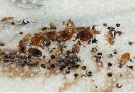 - Остатки продуктов жизнедеятельности. Как и все насекомые, клопы могут оставлять после себя некоторые следы: яйца, фекалии и мелкие чешуйки, обнаружить которые запросто можно под матрасом, в старой мебели, в книгах или одежде.